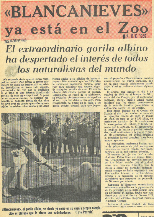 Article de diari que descriu l'estat físic de Floquet de Neu a la seva arribada al Zoològic de Barcelona, amplia la informació amb la imatge d'una dona entregant un plàtan a Floquet de Neu.