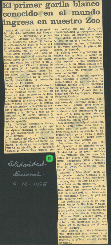 Article sobre l'arribada de Floquet de Neu al Zoològic de Barcelona y els seu estat físic. Cita diversos estudis sobre la pigmentació dels primats.